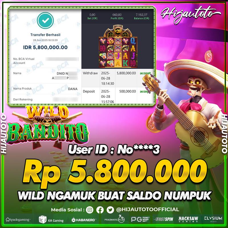 Selamat Kepada Member HIJAUTOTO NO****3 Telah Jackpot Di SLOT WILD BANDITO