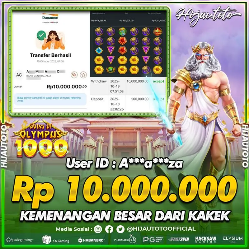 Selamat Kepada Member HIJAUTOTO A*******ZA Telah Jackpot Di SLOT GATES OF OLYMPUS 1000