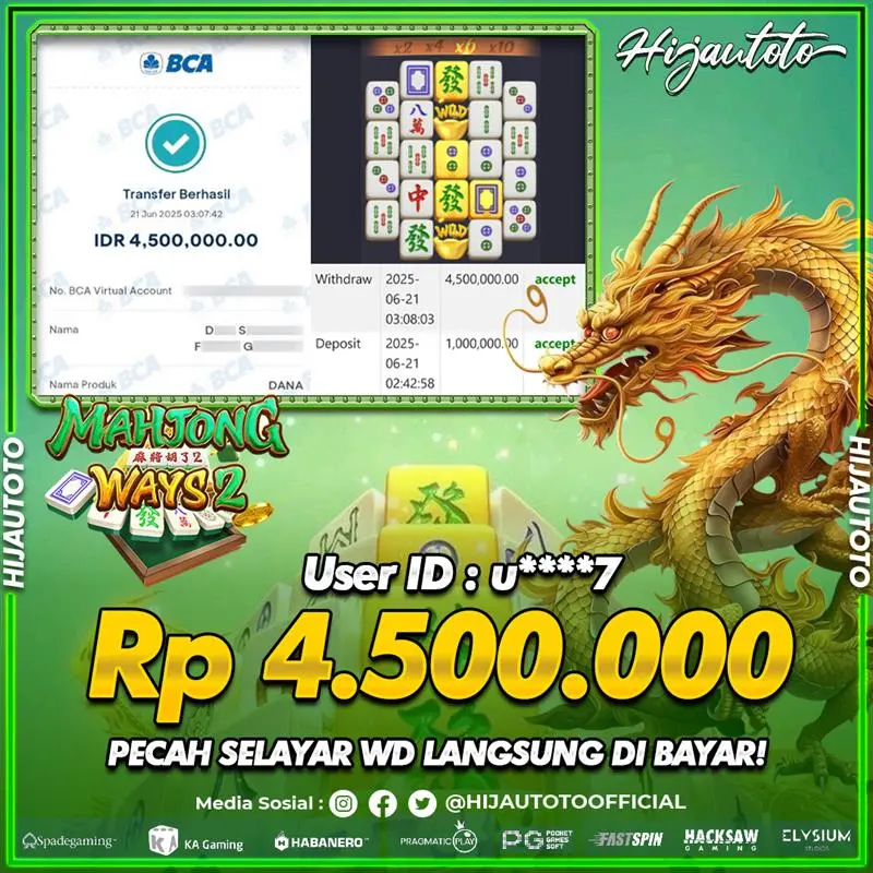 Selamat Kepada Member HIJAUTOTO U****7 Telah Jackpot Di SLOT MAHJONG WAYS 2