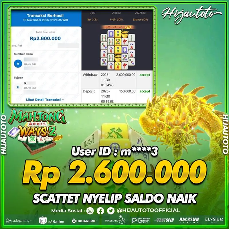 Selamat Kepada Member HIJAUTOTO M****3 Telah Jackpot Di SLOT MAHJONG WAYS 2