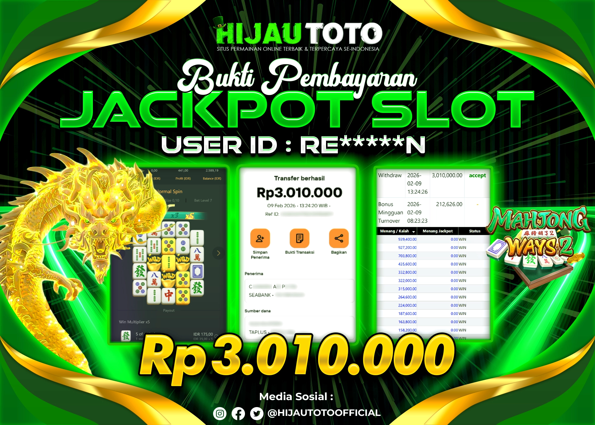 Selamat Kepada Member HIJAUTOTO DE***7 Telah Jackpot Di SLOT MAHJONG WAYS