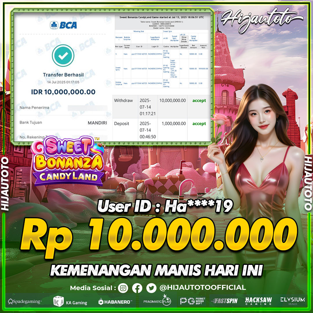 Selamat Kepada Member HIJAUTOTO HA****19 Telah Jackpot Di LIVE CASINO SWEET BONANZA CANDYLAND