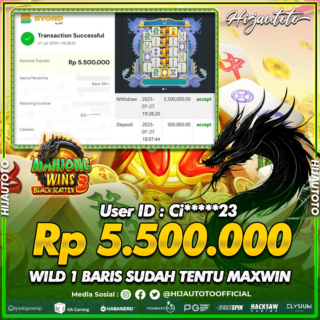 Selamat Kepada Member HIJAUTOTO CL*****99 Telah Jackpot Di SLOT MAHJONG WINS 3 BLACK SCATTER