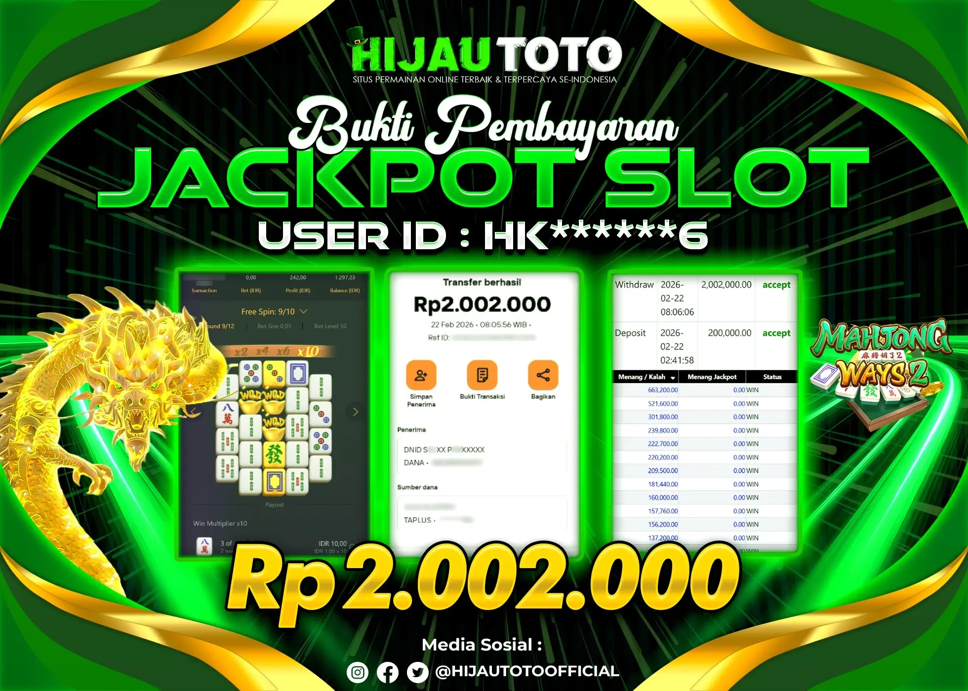 Selamat Kepada Member HIJAUTOTO HK******6 Telah Jackpot Di SLOT MAHJONG WAYS 2