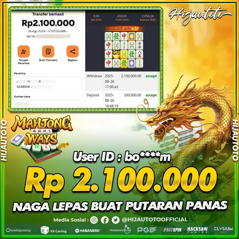 Selamat Kepada Member HIJAUTOTO BO****M Telah Jackpot Di SLOT MAHJONG WAYS